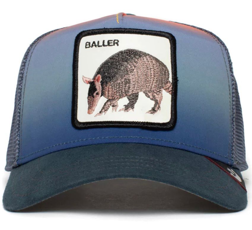 - Patch frontal bordado con un armadillo detallado y la palabra “BALLER” en hilo negro, sobre fondo blanco con borde negro.