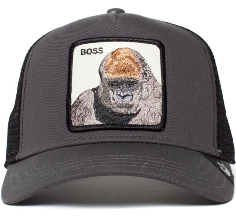 - Patch frontal bordado con un gorila en expresión seria y la palabra “BOSS” en hilo blanco, sobre fondo negro con borde blanco.