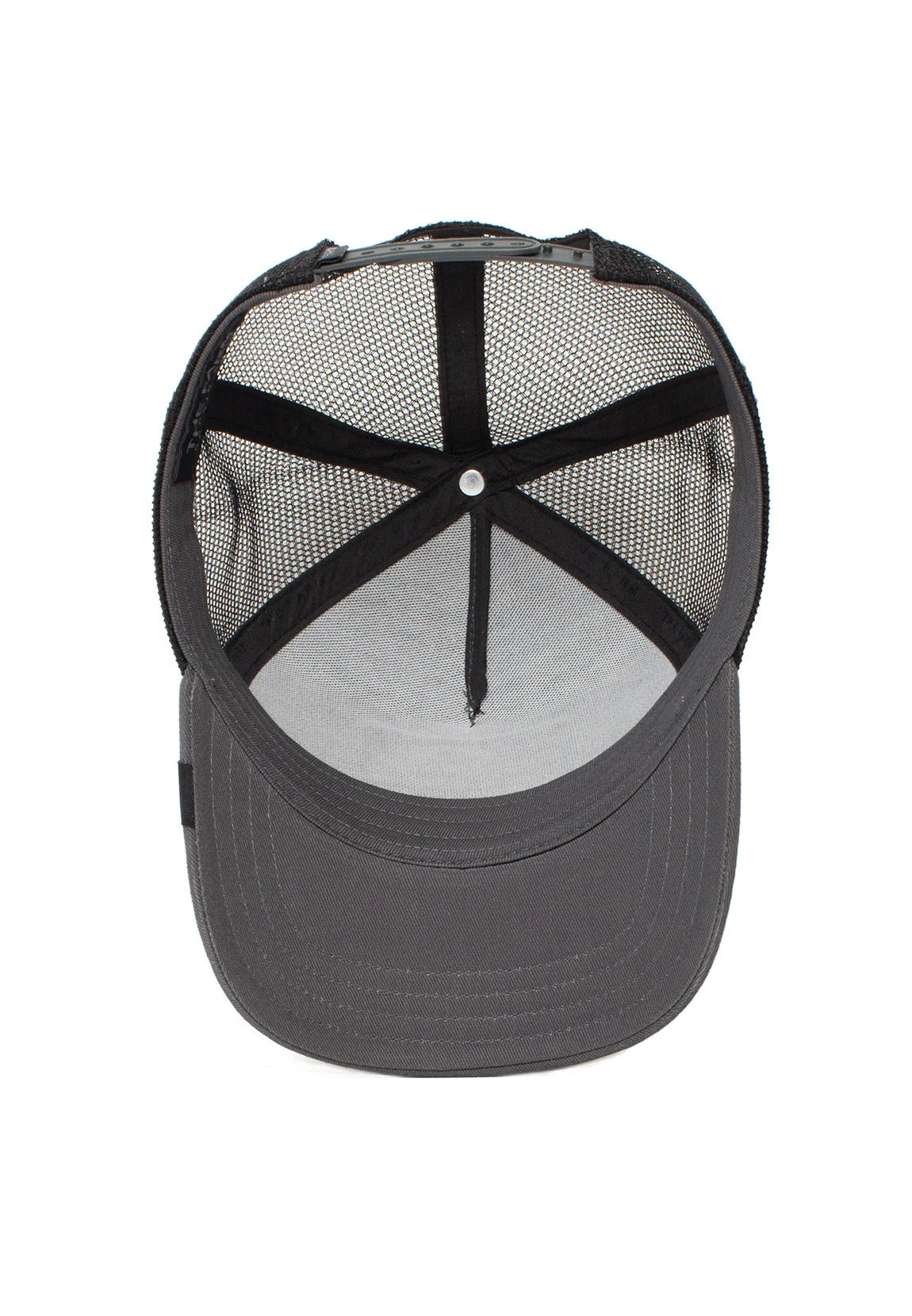- Frente en tela negra (algodón/poliéster), con estructura firme que mantiene la forma.