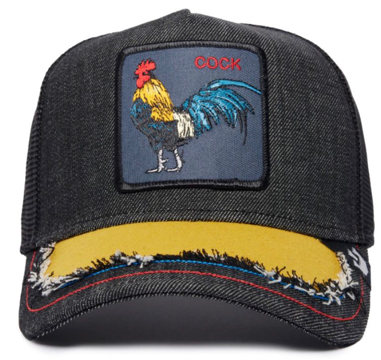 - Patch frontal bordado con la imagen de un gallo multicolor (cuerpo amarillo, cola azul, cabeza roja), sobre un fondo de tela de mezclilla en tono azul. El parche está enmarcado por un borde en hilo negro. En la parte superior derecha del parche, se lee la palabra “COCK” bordada en hilo rojo.
