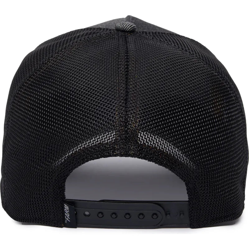 - Visera curva de mezclilla (denim) negra/gris oscuro, con una distintiva franja horizontal en tela amarilla en la parte frontal, que presenta bordes deshilachados con hilos rojos y azules. Tiene costuras decorativas en hilo azul y rojo.