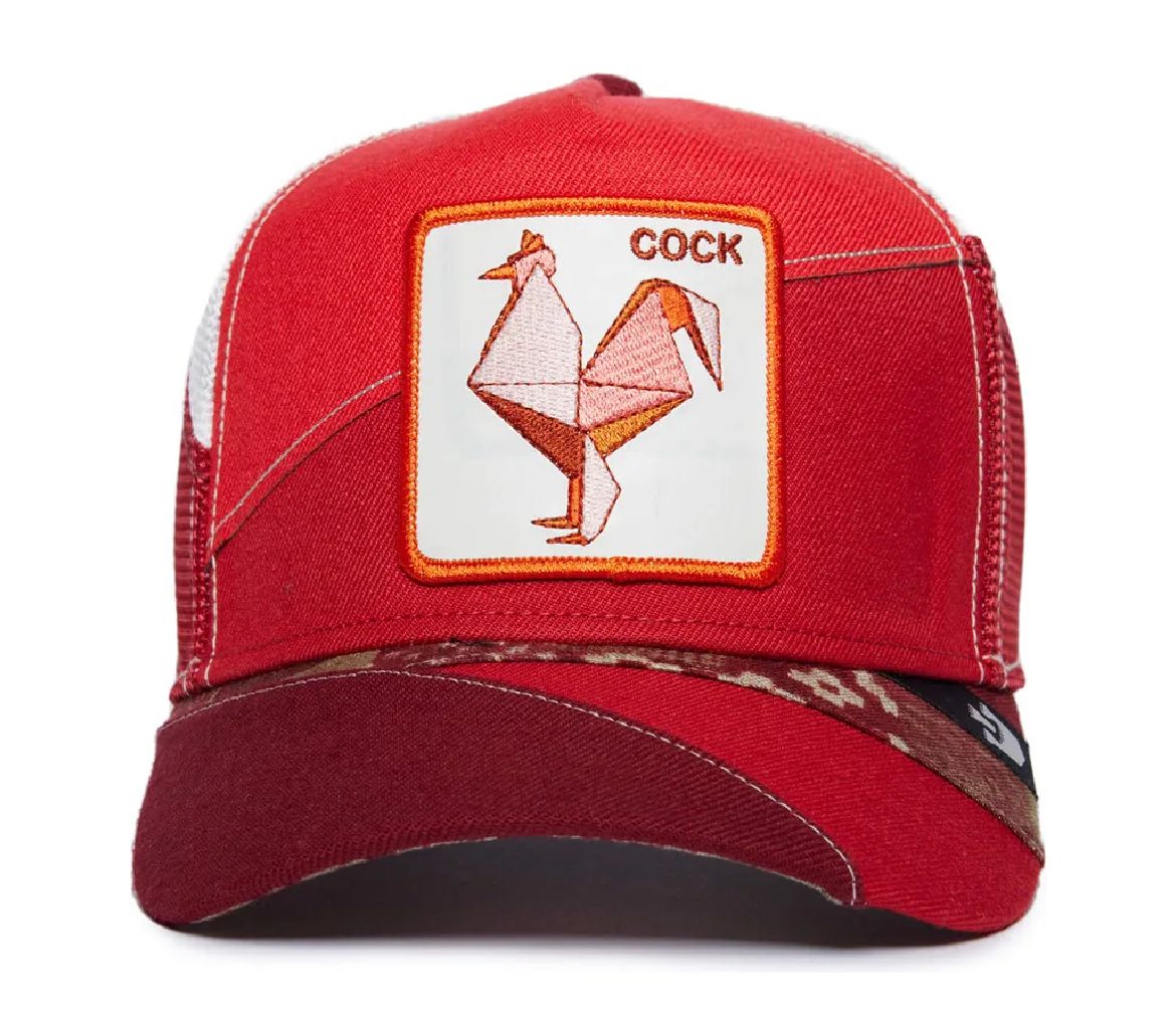 - Patch frontal bordado con la imagen de un gallo de origami en tonos de naranja y rojo, sobre un fondo blanco. En la parte superior derecha del parche, se lee la palabra “COCK” bordada en hilo rojo.