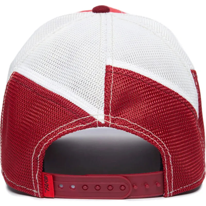 - Frente en tela de paneles de color rojo y rojo oscuro/burdeos, estructurada para mantener la forma. El diseño incluye costuras curvas que separan los tonos de rojo en el frente.