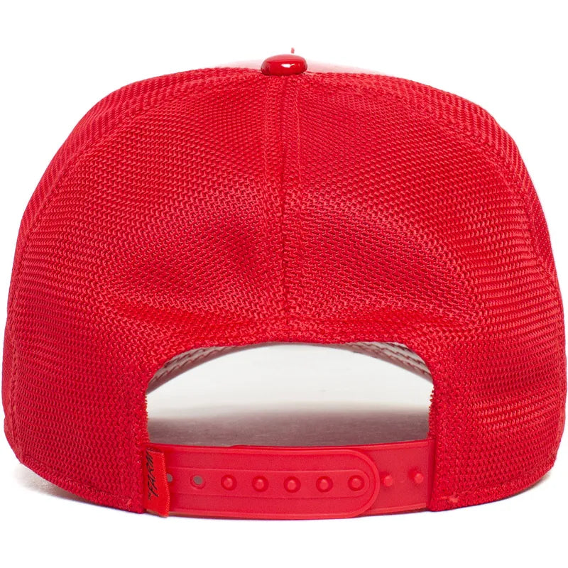- Patch frontal bordado con la imagen de un gallo en relieve, en tonos de hilo rojo sobre un fondo de tela roja, a juego con el color del frente. En la parte inferior central del parche, se lee la palabra “COCK” bordada en hilo rojo.