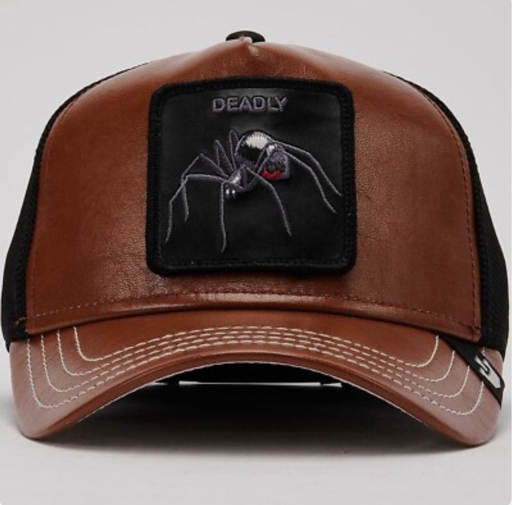 - Patch frontal bordado con diseño de araña y texto “DEADLY”.