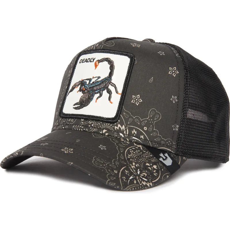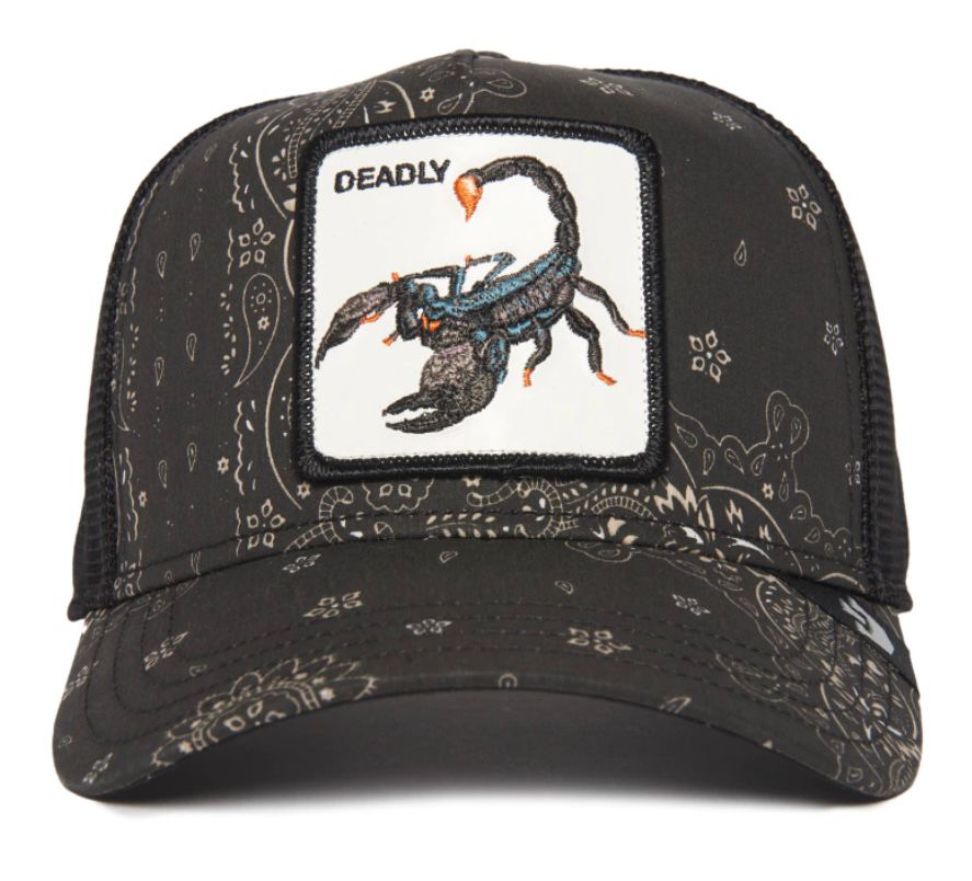 - Patch frontal bordado con la imagen de un escorpión negro y azul con pinzas grandes y cola curvada hacia arriba con aguijón anaranjado, sobre un fondo blanco. En la parte superior izquierda del parche, se lee la palabra “DEADLY” bordada en hilo negro.