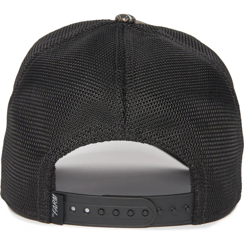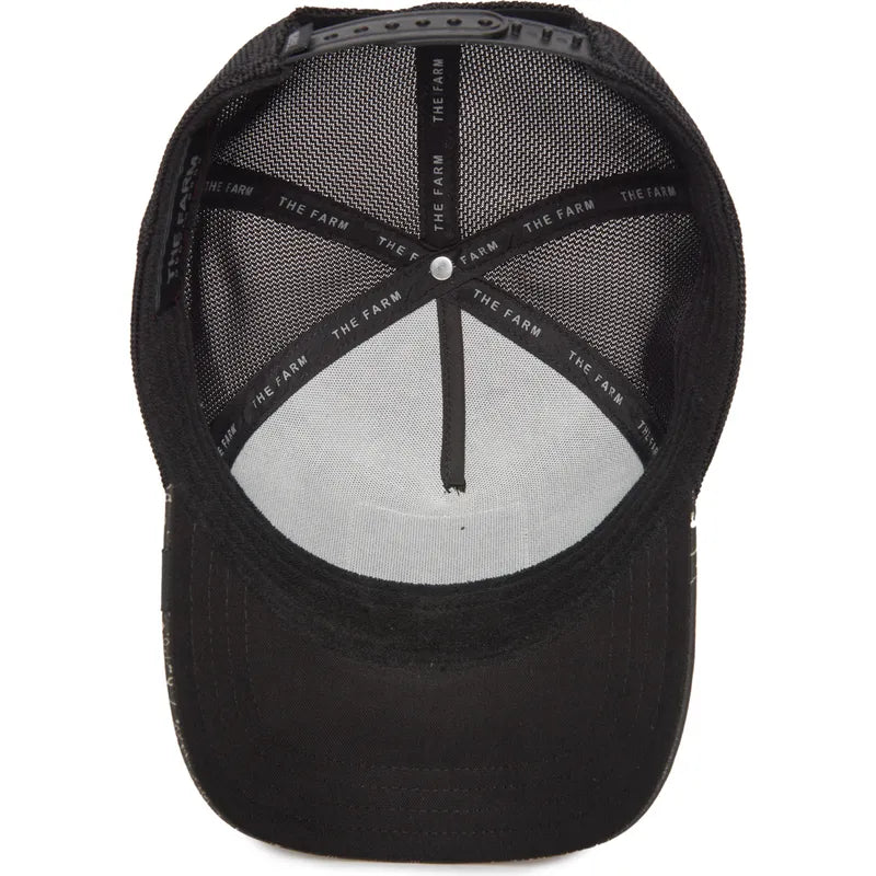 - Visera curva con el mismo patrón de paisley en tonos de negro, beige/crema y gris, con costuras decorativas en hilo negro que la atraviesan.
