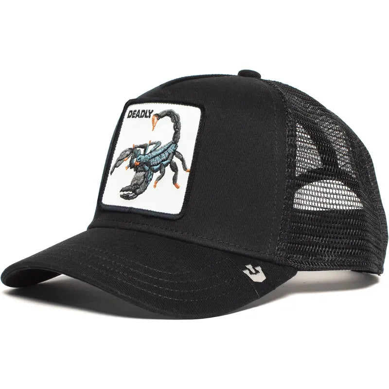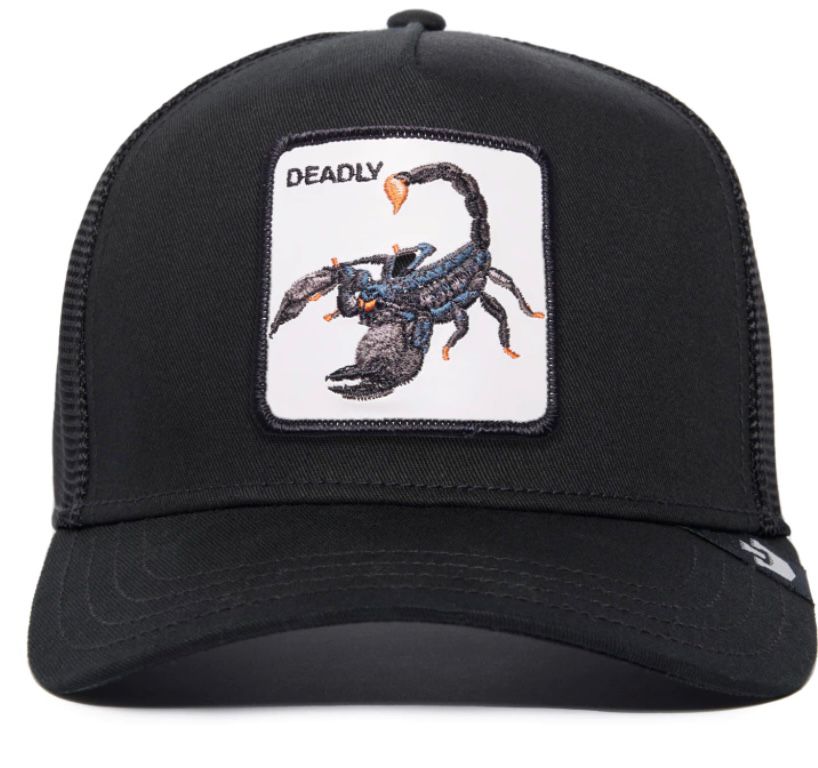 - Patch frontal bordado con la imagen de un escorpión negro y azul con pinzas grandes y cola curvada hacia arriba con aguijón anaranjado, sobre un fondo blanco. En la parte superior izquierda del parche, se lee la palabra “DEADLY” bordada en hilo negro.