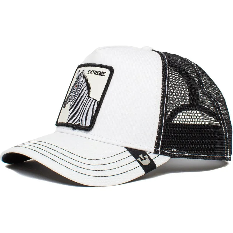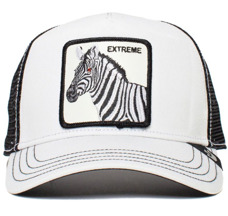 - Patch frontal bordado con una cebra de frente y la palabra “EXTREME” en hilo negro, sobre fondo blanco con borde negro.