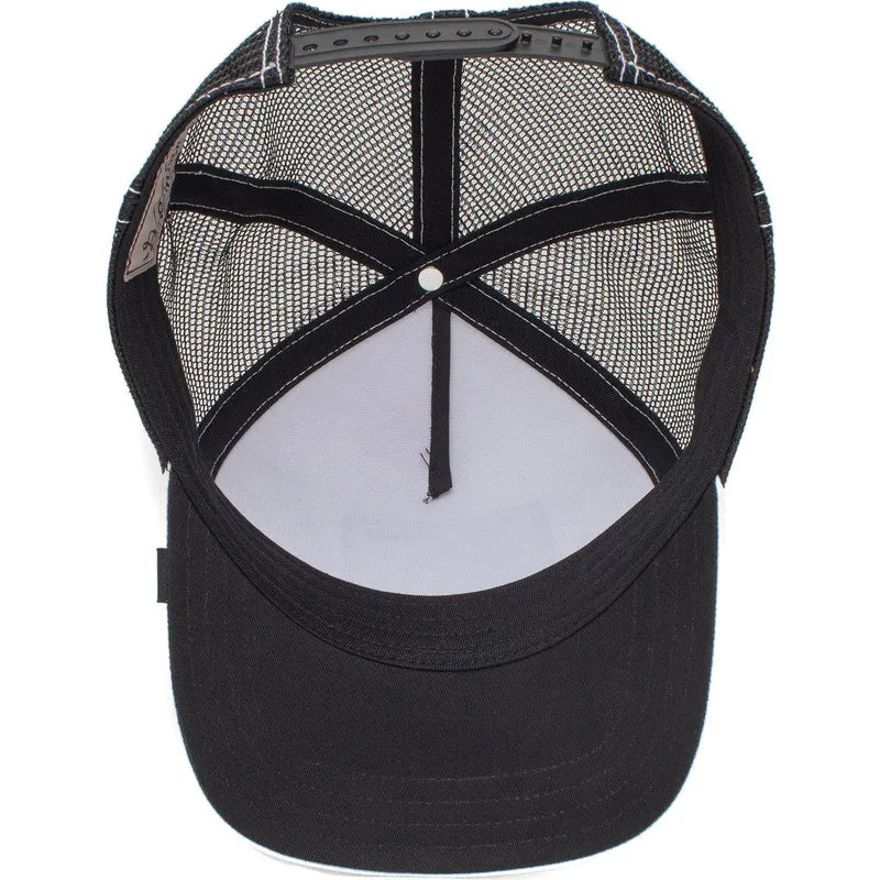 - Visera curva en negro con costuras decorativas negras que refuerzan el contraste del diseño.