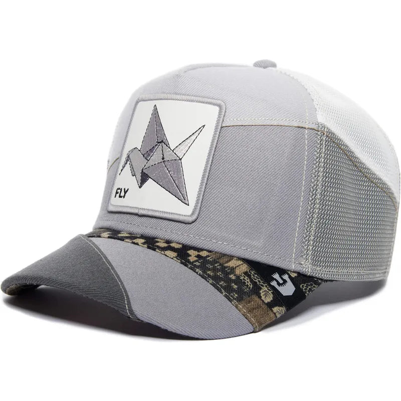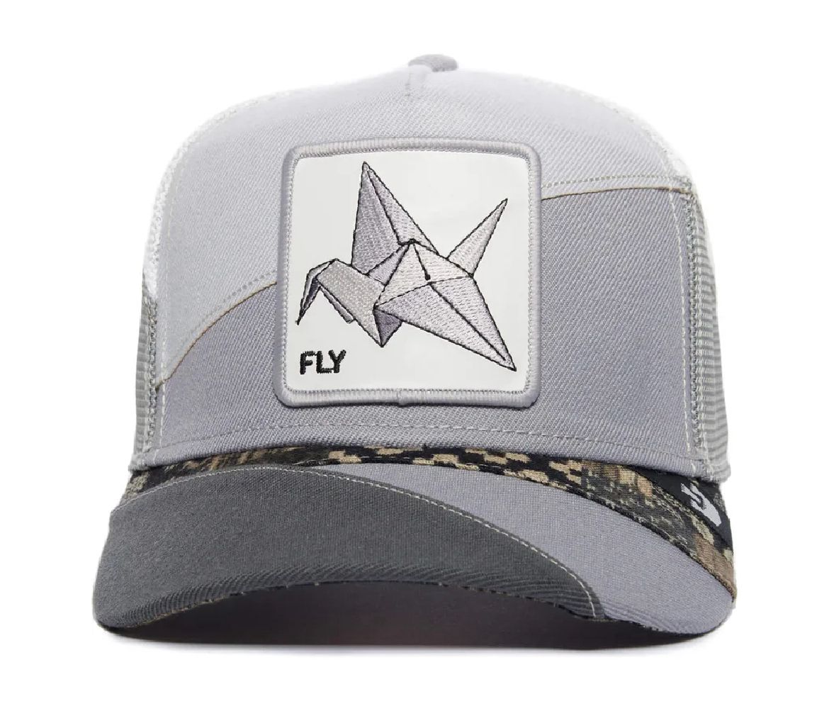 - Patch frontal bordado con la imagen de una grulla de origami en tonos de blanco y gris, sobre un fondo blanco. En la parte inferior izquierda del parche, se lee la palabra “FLY” bordada en hilo negro.