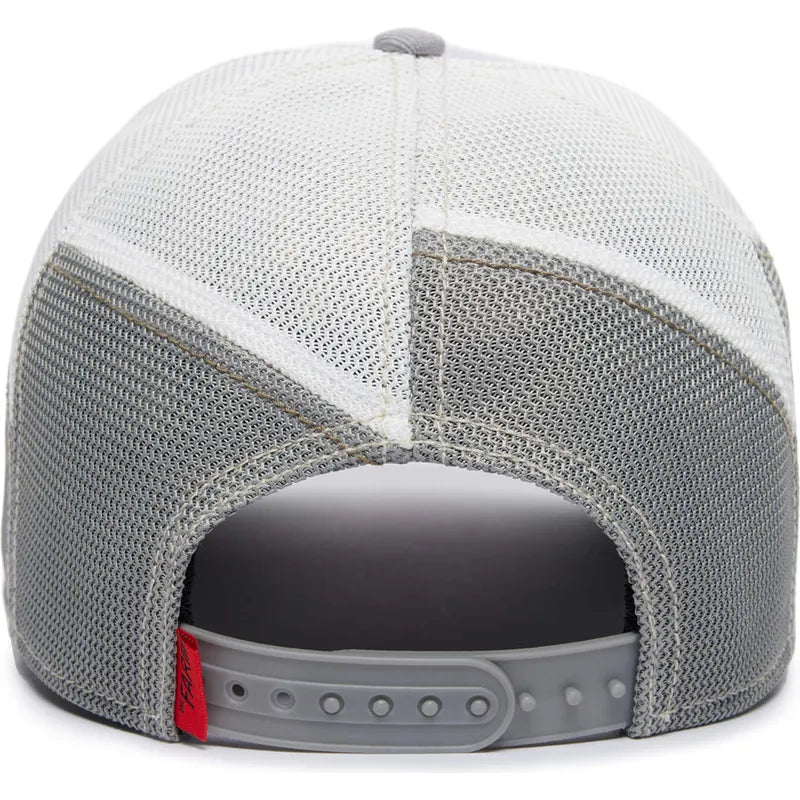 - Frente en tela de paneles de color gris claro y gris medio, estructurada para mantener la forma. El diseño incluye costuras curvas que separan los tonos de gris en el frente.