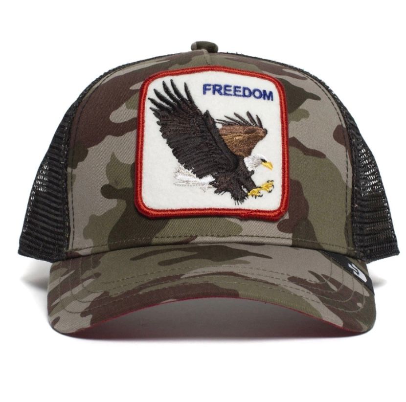 - Patch frontal bordado con la imagen de un águila calva americana en vuelo, en tonos de marrón y blanco con un pico amarillo, sobre un fondo blanco. El parche está enmarcado por un borde en hilo rojo y azul. En la parte superior central del parche, se lee la palabra “FREEDOM” bordada en hilo azul.