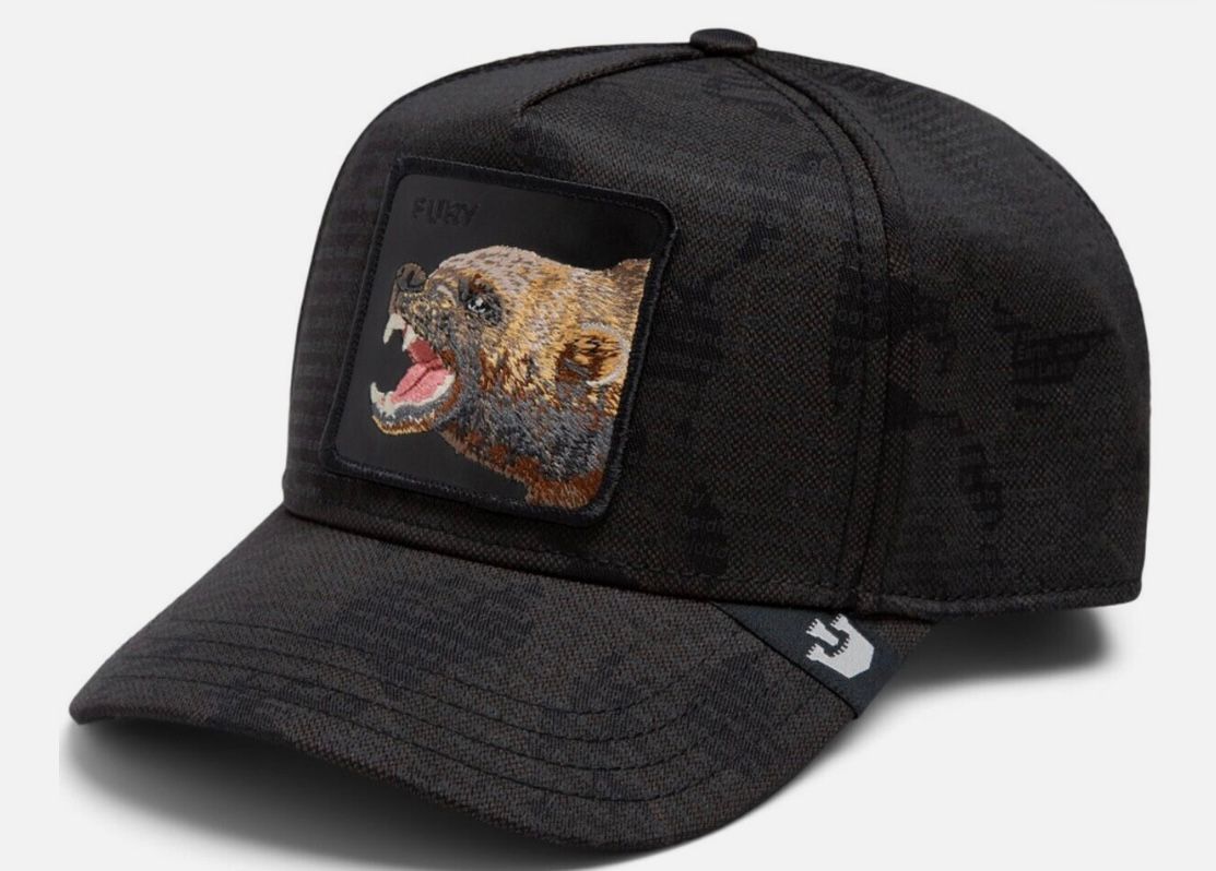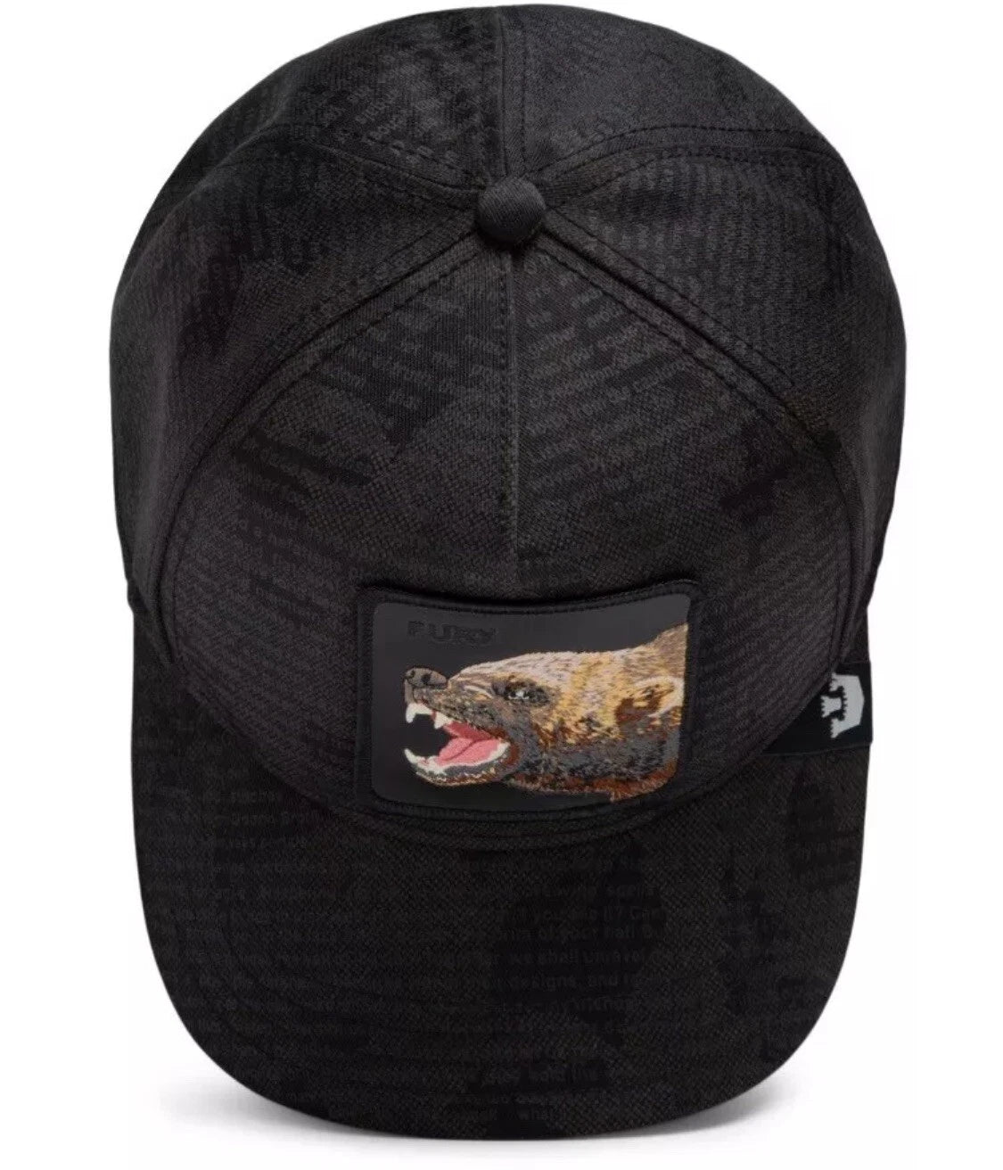 - Patch frontal bordado con la imagen de una hiena rugiendo, mostrando sus dientes y lengua, en tonos de marrón, beige y gris. Los ojos son pequeños y oscuros, característicos de las hienas. El fondo del parche es negro. El parche está enmarcado por un borde en hilo negro. En la parte superior izquierda del parche, se lee la palabra “FURY” bordada en hilo blanco.