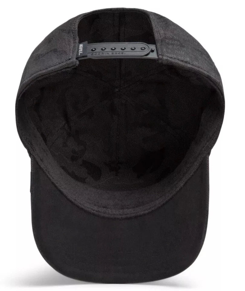 - Frente en tela de color negro con un patrón discreto de camuflaje tono sobre tono o textura similar, estructurada para mantener la forma. La tela del frente tiene propiedades reflectivas, lo que permite que la gorra brille cuando se expone a la luz en la oscuridad.