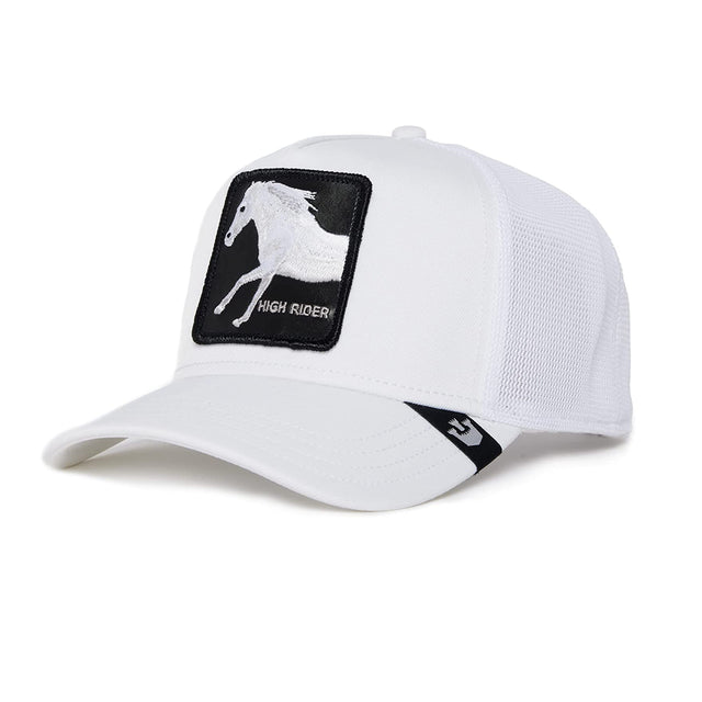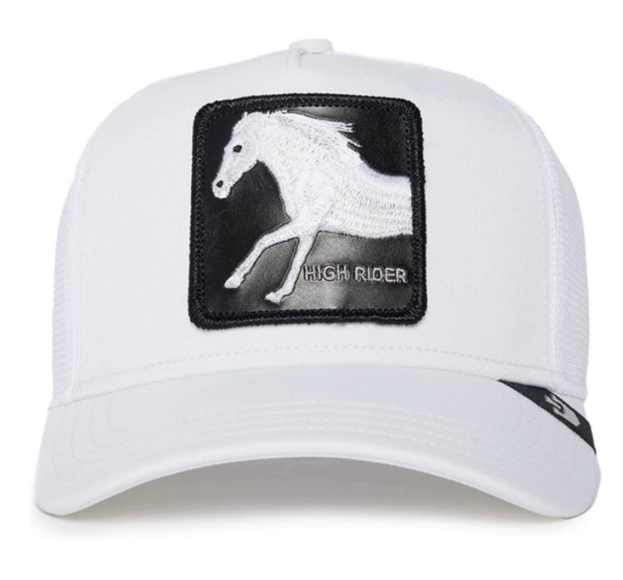 - Patch frontal bordado con la imagen de un caballo blanco al galope, sobre un fondo negro. En la parte inferior central del parche, se lee la frase “HIGH RIDER” bordada en hilo blanco.