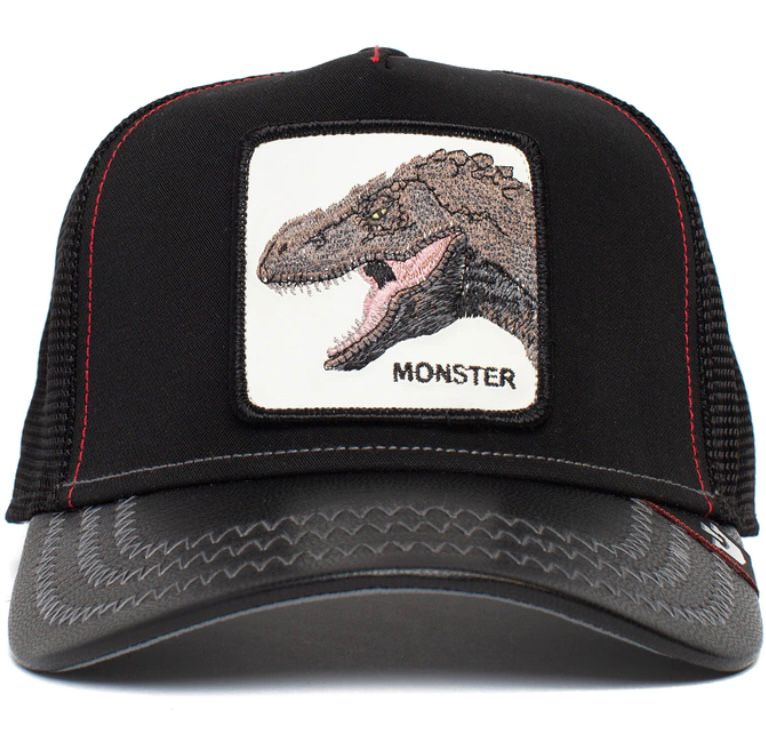 - Patch frontal bordado con la imponente imagen de un dinosaurio (aparentemente un T-Rex o similar) con la boca abierta, mostrando sus dientes afilados, sobre un fondo blanco. En la parte inferior derecha del parche, se lee la palabra “MONSTER” bordada en hilo negro.