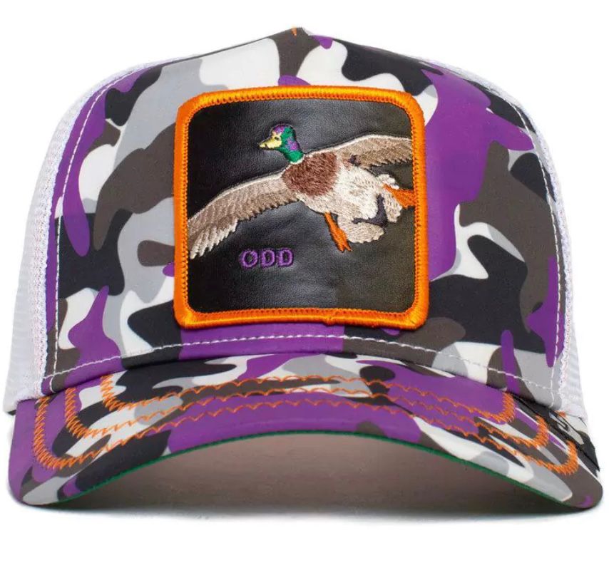 - Patch frontal bordado con la imagen de un pato ánade real volando, con colores naturales en su plumaje (verde en la cabeza, marrón en el cuerpo, blanco en las alas) sobre un fondo negro. El parche está enmarcado por un borde en hilo naranja intenso. En la parte inferior izquierda del parche, se lee la palabra “ODD” bordada en hilo blanco.