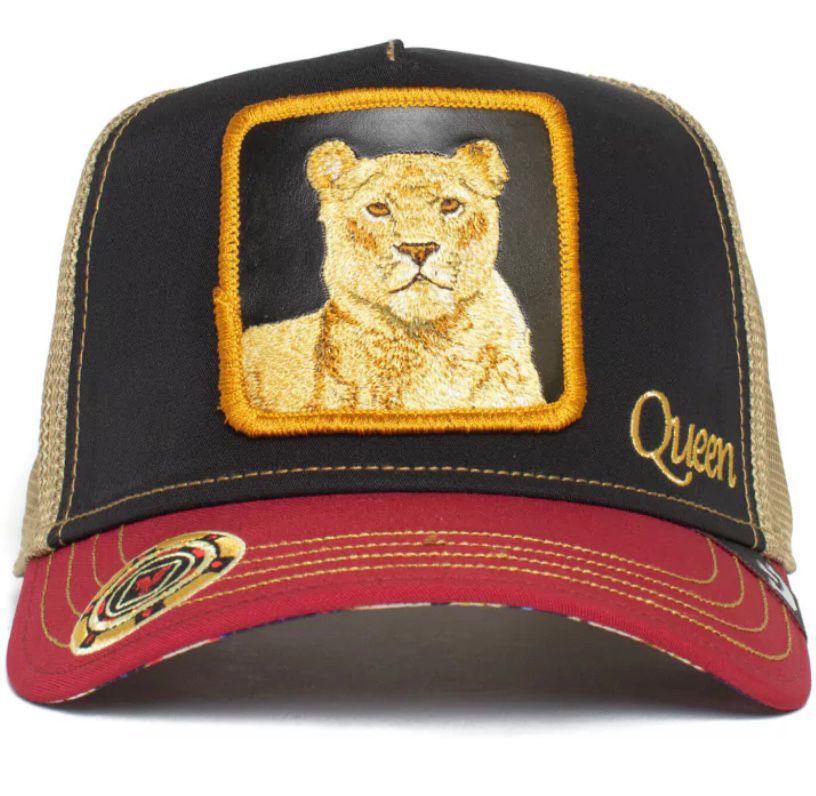 - Patch frontal bordado con la majestuosa imagen de una leona en tonos dorados y beige, sobre un fondo negro. El parche está enmarcado por un borde en hilo dorado/mostaza. A la derecha del parche, se lee la palabra “Queen” bordada en hilo dorado, con un estilo caligráfico.