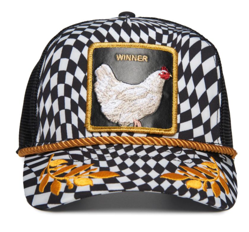 - Patch frontal bordado con la imagen de una gallina blanca con cresta roja, sobre un fondo negro. El parche está enmarcado por un borde en hilo dorado. En la parte superior central del parche, se lee la palabra “WINNER” bordada en hilo blanco.