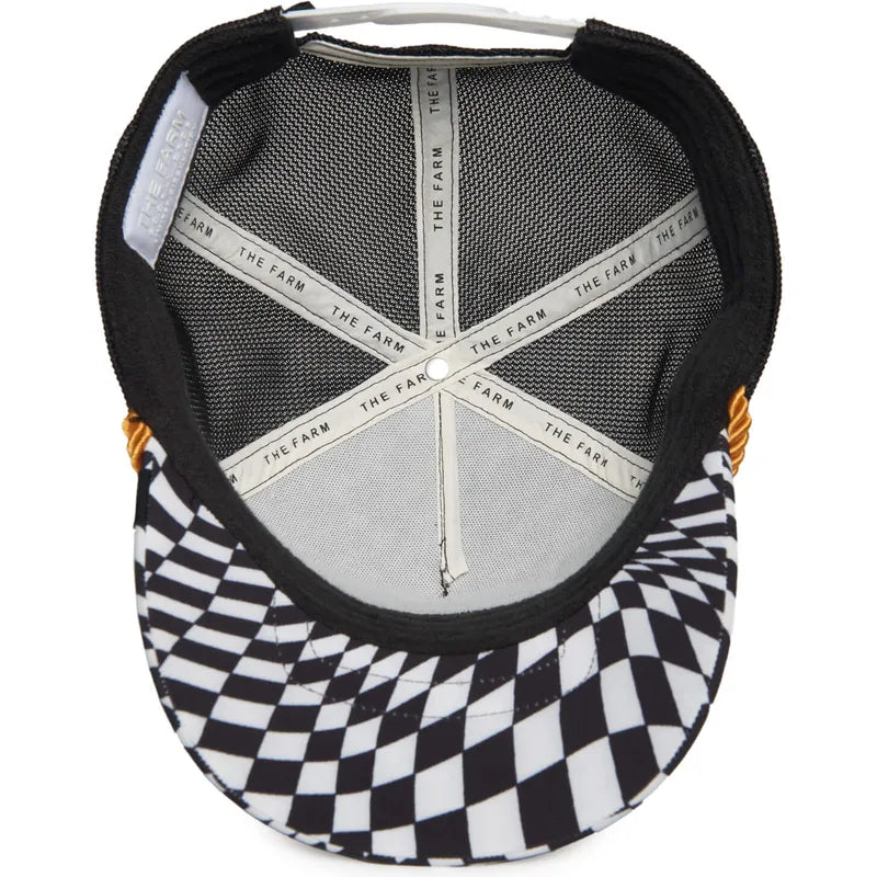 - Visera curva con el mismo patrón de cuadros de carreras en blanco y negro, con bordados detallados en hilo dorado que simulan hojas de laurel o ramas en la parte frontal.