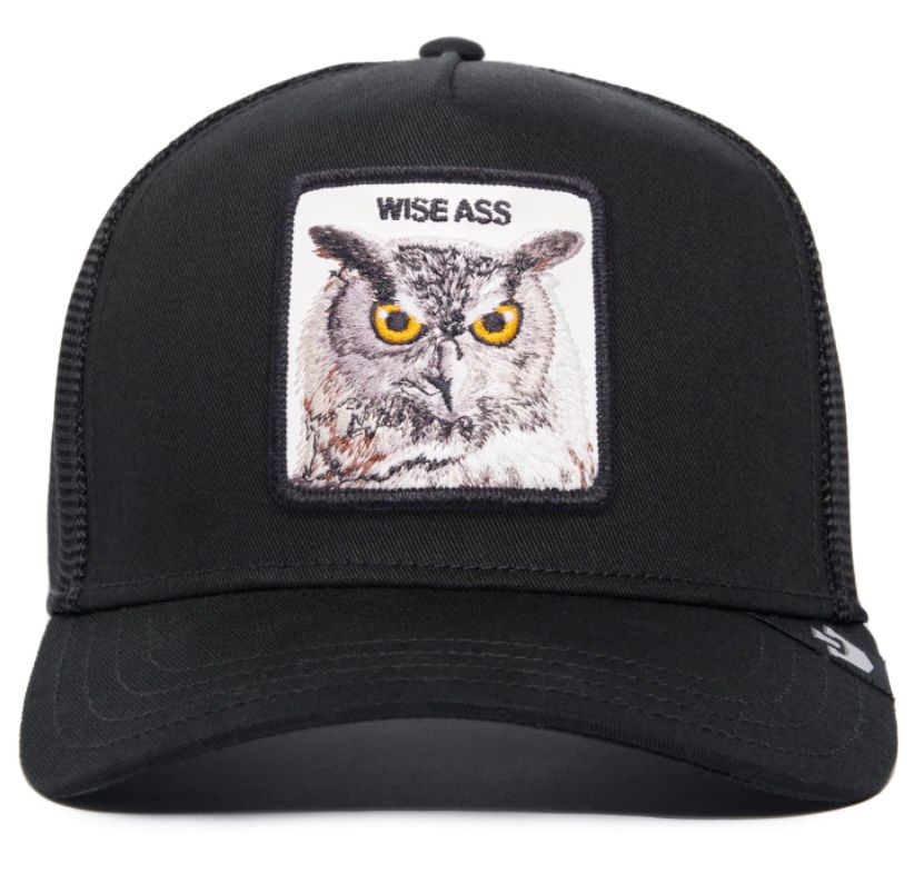 - Patch frontal bordado con la imagen de un búho blanco y gris de ojos amarillos, sobre un fondo blanco. En el parche, se lee la frase “WISE ASS” bordada en hilo negro. El parche está enmarcado por un borde en hilo negro.